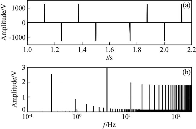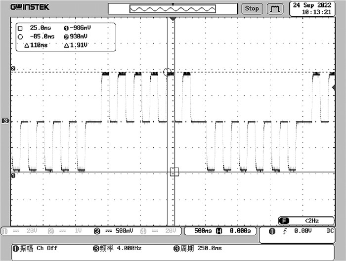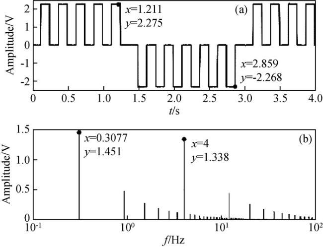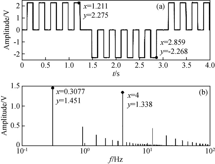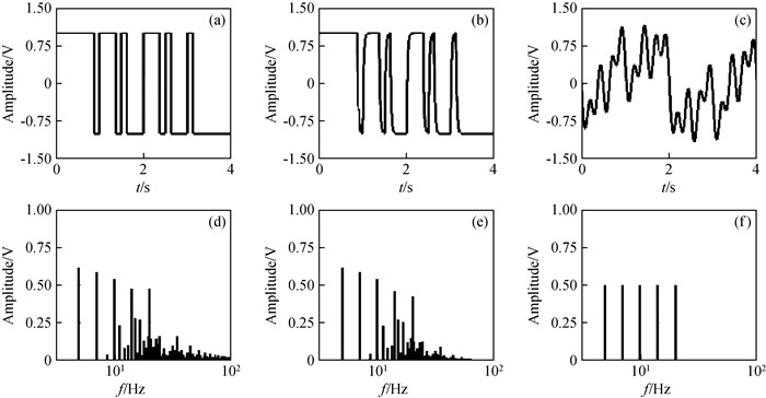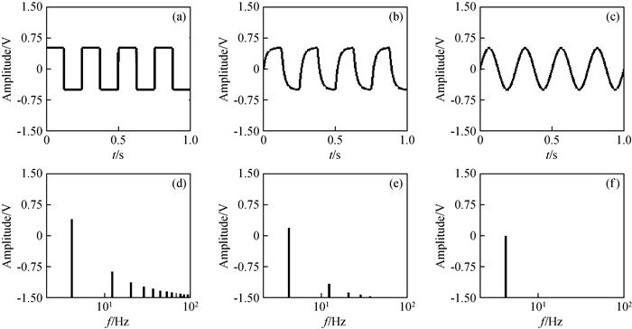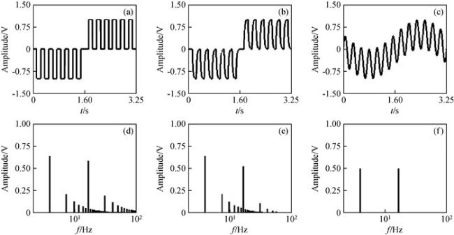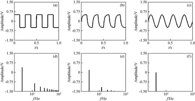 图9 三种4 Hz信号波形及其频谱图Fig 9 Three kinds of 4 Hz signal waveforms and their spectrum diagrams (a, d)The figure shows the ideal rectangular wave and its spectrum; (b, e)The figure shows the rectangular wave and its spectrum after low-pass filtering; (c, f)The figure shows the sine wave and its spectrum. |