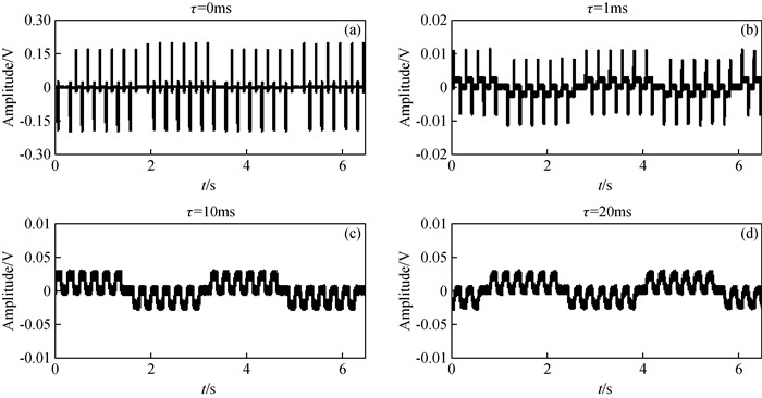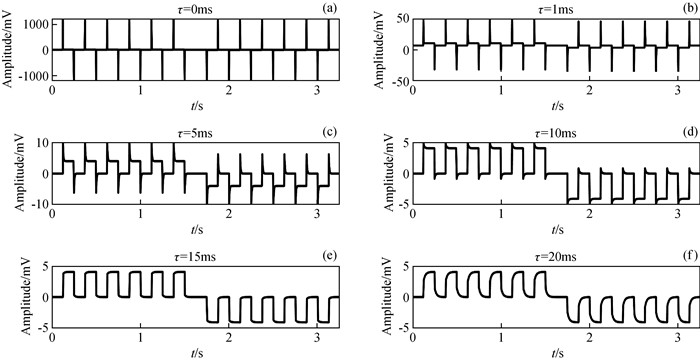 表1 0~20 ms时间常数低通网络对耦合尖峰的压制效果Table 1 Suppression effect of 0~20 ms time constant low pass network on coupling spikes |