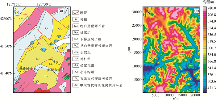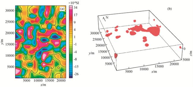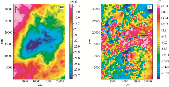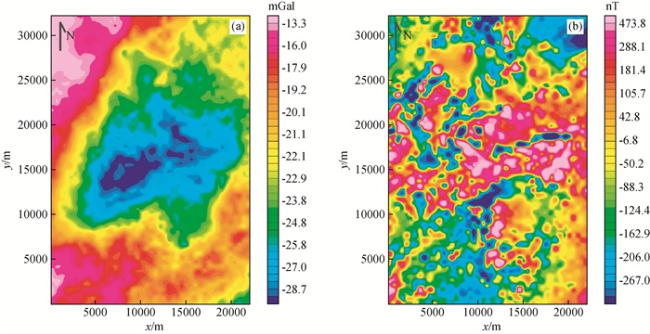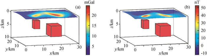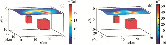 图4 起伏地形重磁模型位置与含5%噪声正演结果图(a)密度模型与含5%噪声重力正演结果;(b)含5%噪声磁化强度模型与磁法正演结果. Fig 4 Model position and contains a 5% random noise forward results under undulating terrain (a) Forward model and contains a 5% random noise gravity anomaly; (b) Forward model and contains a 5% random noise magnetic anomaly. |