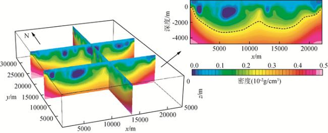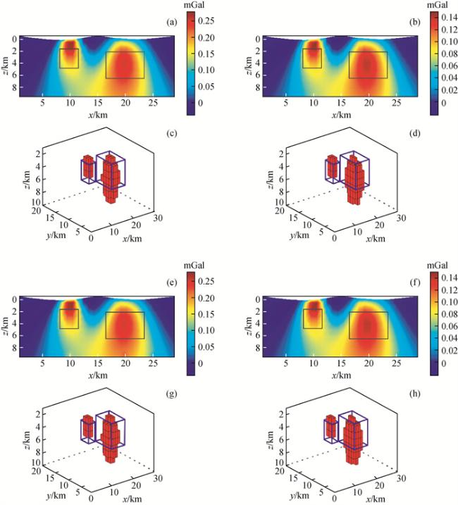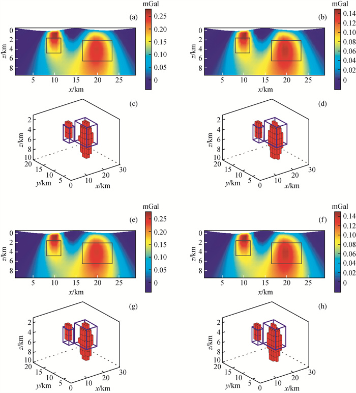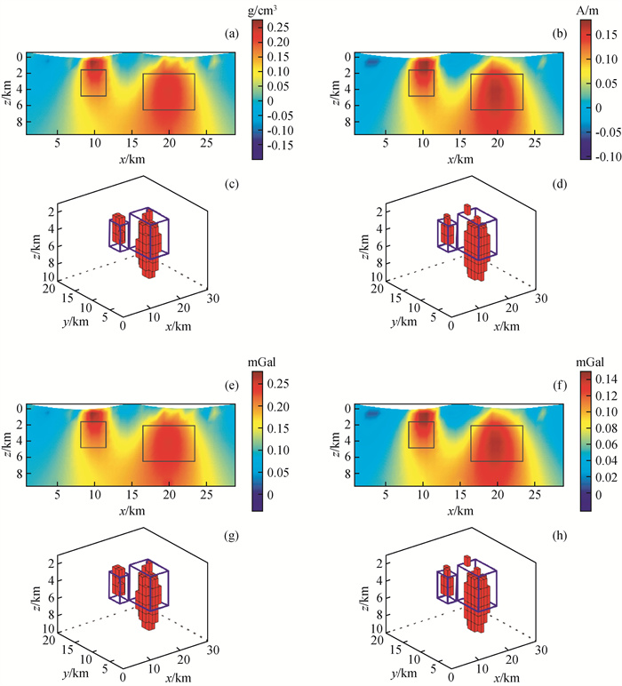 图3 起伏地形重磁联合反演对比图(a)起伏地形常规重磁联合反演密度结果切片图(y=10000 m);(b)起伏地形常规重磁联合反演磁化强度结果切片图(y=10000 m);(c) 起伏地形常规重磁联合反演三维密度分布(大于0.195 g/cm3);(d) 起伏地形常规重磁联合反演三维磁化强度分布(大于0.115 A/m;(e)曲化平重磁快速联合反演密度结果切片图(y=10000 m);(f)曲化平重磁快速联合反演磁化强度结果切片图(y=10000 m);(g)曲化平重磁快速联合反演三维密度分布(大于0.195 g/cm3);(h)曲化平重磁快速联合反演三维磁化强度分布(大于0.115 A/m). Fig 3 Contrast of results of joint inversion of gravity and magnetic with undulating terrain (a) Slice of density result of gravity and magnetic joint inversion of undulating terrain (y=10000 m); (b) Slice of magnetic result of gravity and magnetic joint inversion of undulating terrain (y=10000 m); (c) Three-dimensional density distribution of undulating terrain retrieved by joint inversion of gravity and magnetic (>0.195 g/cm3); (d) Three-dimensional magnetization distribution of undulating terrain retrieved by joint inversion of gravity and magnetic (>0.115 g/cm3); (e)Slice of density results of fast joint inversion of gravity and magnetic (y=10000 m); (f) Slice of magnetization results of fast joint inversion of gravity and magnetic (y=10000 m); (g) Three-dimensional density distribution of fast joint inversion of gravity and magnetic (>0.195 g/cm3); (h) Three-dimensional magnetization distribution of fast joint inversion of gravity and magnetic (>0.115 g/cm3). |