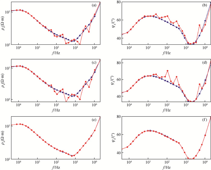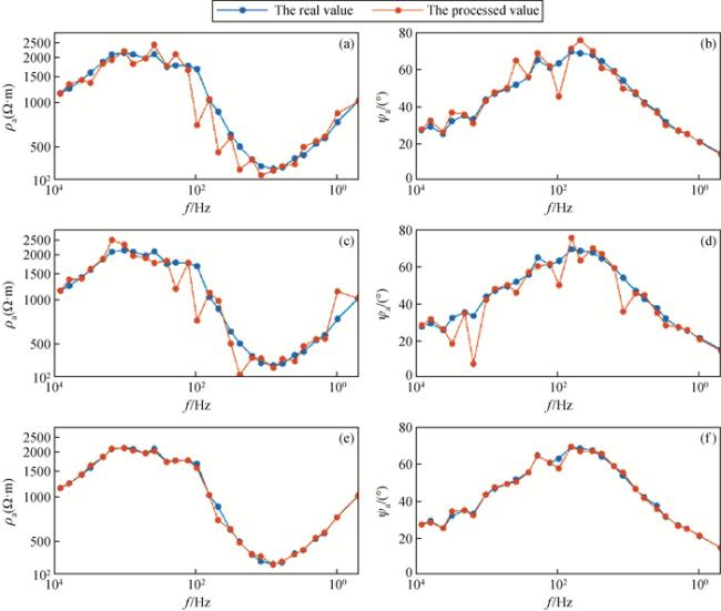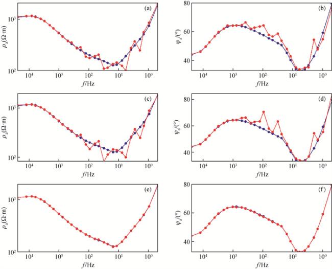 图10 通过三种方法得到的视电阻率和视相位,并与真实值作对比(a)和(b)为均值叠加法获得的视电阻率和相位;(c)和(d)为稳健叠加法获得的视电阻率和相位;(e)和(f)为联合降噪法获得的视电阻率和相位. Fig 10 Apparent resistivity and apparent phase obtained by three methods and compared with the real values (a) and (b) are the apparent resistivity and phase obtained by the mean superposition method; (c) and (d) are the apparent resistivity and phase obtained by the robust superposition method; (e) and (f) are the apparent resistivity and phase obtained by the joint noise reduction method. |