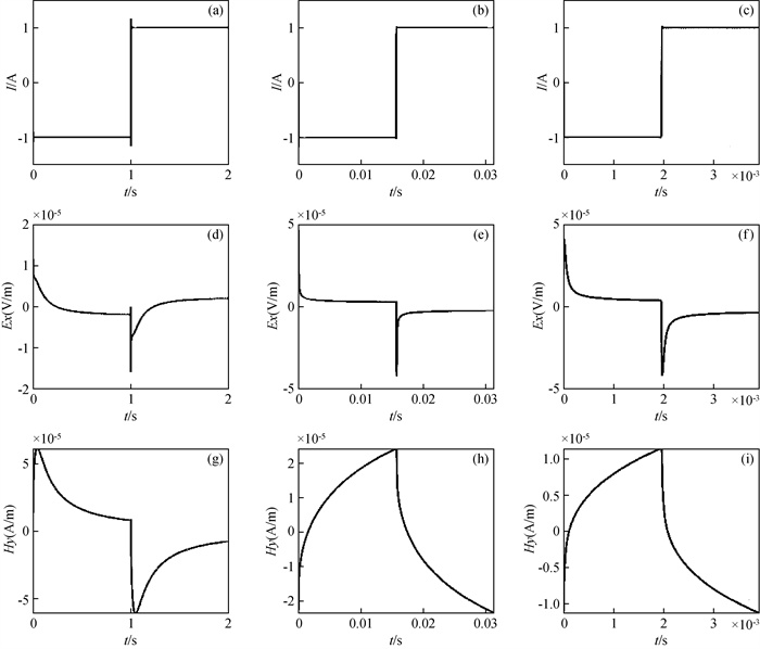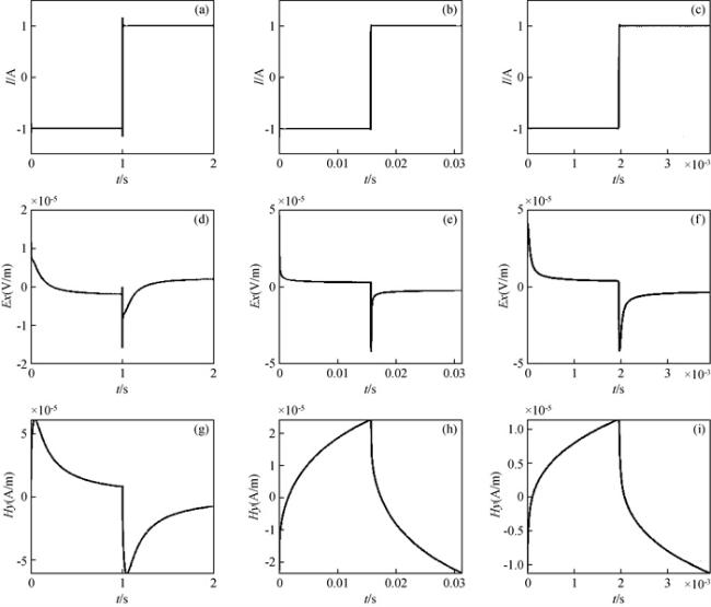 图8 三个高质量电磁场的时间序列(a)、(b)和(c)分别是基频0.5 Hz、32 Hz和256 Hz的发射电流;(d)、(e)和(f)分别是基频0.5 Hz、32 Hz和256 Hz的电场;(g)、(h)和(i)分别是基频0.5 Hz、32 Hz和256 Hz的磁场. Fig 8 Time series of three high-quality electromagnetic fields (a), (b) and (c) are emission currents with fundamental frequencies of 0.5 Hz, 32 Hz and 256 Hz, respectively; (d), (e) and (f) are electric fields with fundamental frequencies of 0.5 Hz, 32 Hz and 256 Hz, respectively; (g), (h) and (I) are magnetic fields with fundamental frequencies of 0.5 Hz, 32 Hz and 256 Hz, respectively. |