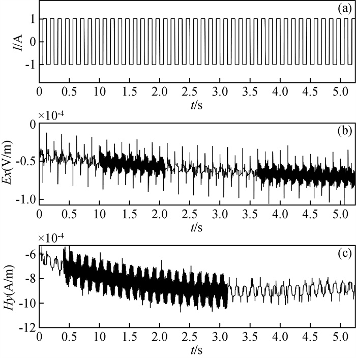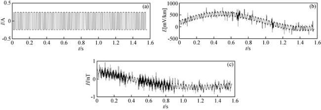 图11 加入仿真噪声的电磁场数据(基频为32 Hz)(a)激励电流;(b)加入仿真噪声干扰的电场;(c)加入仿真噪声干扰的磁场. Fig 11 Electromagnetic field data with simulated noise (fundamental frequency is 32 Hz) (a) Excitation current; (b) Electric field with simulated interferences; (c) Magnetic field with simulated noise interference. |
