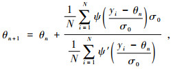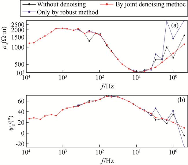 图13 采用三种方法对某测点实测电磁场数据进行处理所得视电阻率和视相位曲线黑线为常规多次叠加方法,蓝线为稳健叠加方法,红线为本文联合降噪方法. Fig 13 Apparent resistivity and apparent phase curves obtained by processing the measured electromagnetic field data of a measuring point with three methods The black line is the conventional multiple superposition method, the blue line is the robust superposition method, and the red line is the joint noise reduction method. |