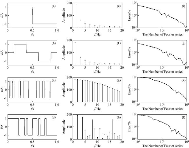 图1 人工源电磁勘探常用激励电流波形和频谱及拟合误差随傅里叶级数数量的变化曲线从上至下分别为方波、双极性波、扩频波、伪随机波等. Fig 1 Excitation current waveform and its frequency spectrum commonly used in artificial source electromagnetic exploration, the changing of waveform reconstruction error with the increase of the number of Fourier series is also shown From top to bottom are square wave, bipolar wave, spread spectrum wave, pseudo-random wave, etc. |