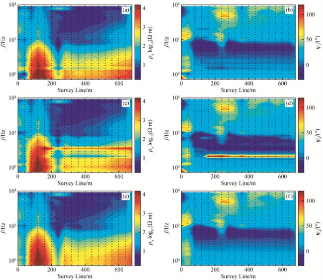 图14 采用三种方法对电磁场时间序列进行处理后计算得到某测线视电阻率和视相位拟断面图(a)和(b)为常规多次叠加方法;(c)和(d)为稳健叠加方法;(e)和(f)为联合降噪方法. Fig 14 The apparent resistivity and apparent phase pseudo profiles of a survey line are calculated after processing the electromagnetic field time series with three methods (a) and (b) are conventional multiple stacking methods; (c) and (d) are robust stacking methods; (e) and (f) are joint noise reduction methods. |