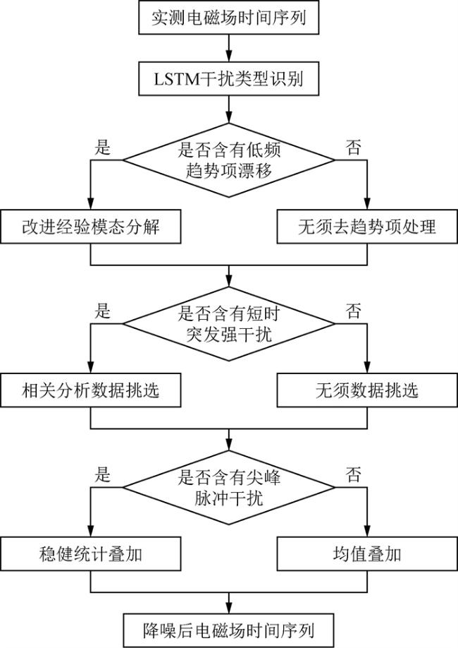 Controlled-Source Audio Magnetotelluric (CSAMT) is a near-surface geophysical method that developed on the basis of Magnetotelluric method (MT). With the development of social economy,the data quality of CSAMT has also been seriously disturbed by noise interference. In practical exploration,the time series of electromagnetic field is usually superimposed with large-scale trend drift,short-term sudden strong interference and peak impulsive outliers,resulting in the distortion of the calculated resistivity spectrum. In this paper,an anti-interference processing method based on deep learning and joint de-noising is proposed to preprocess CSAMT time series. Firstly,a forward algorithm of electromagnetic time series of layered earth controllable source is proposed,which is used to generate standard electromagnetic signals without noise interference. Then,a Long and Short Term Memory Neural Network (LSTM) classifier is trained to recognize the noise. Finally,the improved Empirical Mode Decomposition (EMD) algorithm,correlation based data selection algorithm and robust statistical algorithm are jointly used to de-noise the CSAMT time series. The test results by simulated data show that the recognition accuracy of LSTM for noise interference can reach more than 95%,and the three noise reduction algorithms can reduce the data error from about 20% to less than 3%. Finally,the proposed method is applied to the actual data set of a metal mining area in Inner Mongolia. the accuracy of low-frequency resistivity and phase was effectively improved.