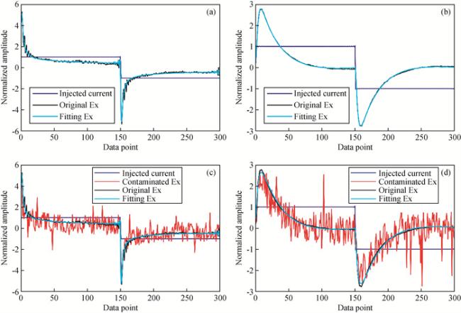 图6 原始电磁场和波形拟合电磁场对比示意图Fig 6 Comparison diagram of original electromagnetic field and fitting electromagnetic field (a) Original electric field and fitting electric field; (b) Original magnetic field and fitting magnetic field; (c) Noisy electric field and fitting electric field; (d) Noisy magnetic field and fitting magnetic field. |