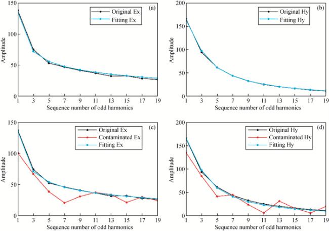 图7 原始电磁场、受污染电磁场和拟合电磁场的低频频谱(只有前19个奇谐波)(a)原磁场和拟合磁场的频谱;(b)原磁场和拟合磁场的频谱;(c)原磁场、污染磁场和拟合磁场的频谱;(d)原磁场、污染磁场和拟合磁场的频谱. Fig 7 The low-frequency spectrum (only the first 19 odd harmonics) of the original, contaminated, and fitting electromagnetic fields (a) The spectrums of original and fitting electric fields; (b) The spectrums of original and fitting magnetic fields; (c) The spectrums of original, contaminated and fitting electric fields; (d) The spectrums of original, contaminated and fitting magnetic fields. |