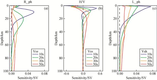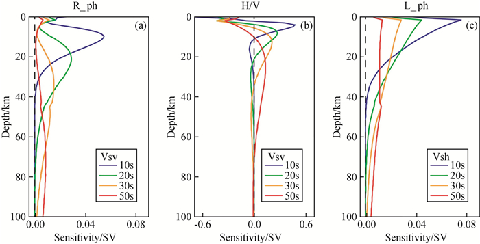 图1 周期10 s、20 s、30 s和50 s的(a)瑞雷面波相速度和(b)H/V以及(c)勒夫面波相速度分别对不同深度的Vsv和Vsh的敏感度,计算所用模型为Shen等(2016)发布的位于渤海盆地西缘的平均模型Figure 1 Sensitivity kernels of (a) Rayleigh-wave phase velocities, (b) H/V and (c) Love-wave phase velocities to perturbations of Vsv or Vsh at 10, 20, 30 and 40 s periods, which is based on the the averge model of western Bohai Bay Basin published from Shen et al. (2016) |