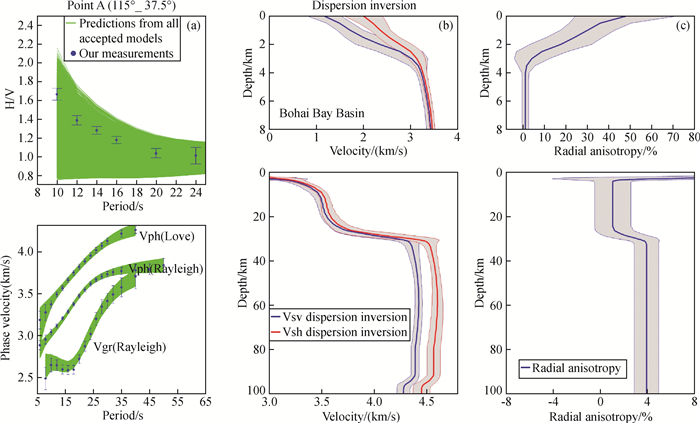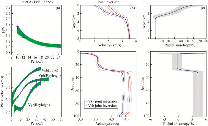 3 以图 2中点A为例,面波频散单独反演的结果(a)蓝色误差棒代表观测的面波频散和H/V及对应的不确定度,绿色实线代表基于MCMC反演方法得到的所有被接受模型正演预测的面波频散和H/V;(b)蓝色和红色实线分别代表所有被接受的Vsv和Vsh模型的平均值;(c)蓝色实线代表所有被接受模型的径向各向异性的平均值.在图(b,c)中,灰色区域的宽度代表所有被接受模型参数的标准差. The result of dispersion inversion at point A identified in Fig. 2 (a)The blue error bars represent the observed H/V and dispersion curves with associated uncertainties, the green lines represent the predictions computed from all accepted models from the MCMC inversion; (b) The means of the Vsv and Vsh distributions are identified with the blue and red lines; (c) The means of the radial anisotropy distributions are identified with blue lines. In (b, c), the one standard deviation contours of model parameters are shown with gray corridors. |