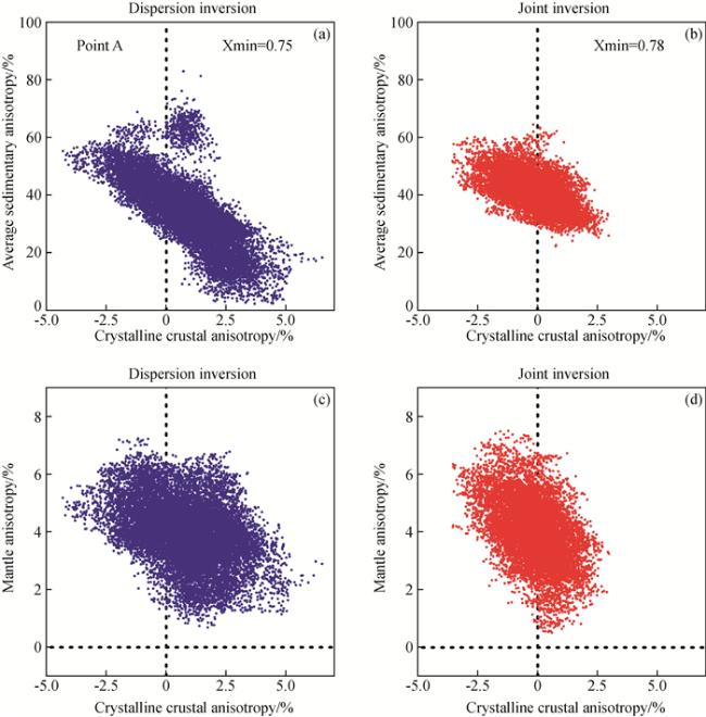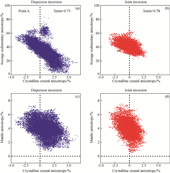 图5 以图 2中A点为例,(a)基于相速度频散单独反演和(b)联合反演得到的所有被接受模型的平均沉积层的径向各向异性与结晶地壳的径向各向异性的分布;(c,d)与(a,b)类似,但是为所有被接受模型的地幔的径向各项异性与结晶地壳的径向各向异性的分布Figure 5 The distributions of average sedimentary anisotropy and crystalline crustal anisotropy from all accepted models for point A based on (a) dispersion inversion and (b) joint inversion, respectively; (c, d) similar to (a, b), but for the distributions of mantle anisotropy and crystalline crustal anisotropy from all accepted models |