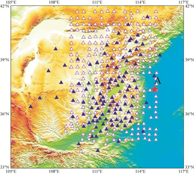 图2 研究区的地震台站分布图蓝色三角形代表研究中使用的106个EOBSArray台站(Xu et al., 2020).本文收集了Huang等(2021)基于白色三角形所示的ChinArray的295个地震台站测量的H/V.图中红色五角星标注了本文采用的实际案例的所在位置. Figure 2 The seismic station distributions in our study region The blue triangles represent the 106 EOBSArray stations(Xu et al., 2020). The white triangles mark the 295 seismic stations during the Phase Ⅲ deployment of the ChinArray Project among which we collect the H/V measurements from Huang et al. (2021). The red star denote the location of the practical case used in this study. |