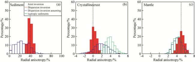 6 基于理论模型反演计算得到的(a)沉积层、(b)结晶地壳和(c)地幔的横波速度径向各向异性的后验概率分布蓝色和红色柱状图分别为面波相速度频散单独反演和引入H/V联合反演得到的径向各向异性的后验概率分布;此外,绿色柱状图为基于面波相速度频散反演并假设各向同性沉积层得到的径向各向异性的后验概率分布.本文采用的理论模型为Shen等(2016)发布的位于渤海盆地西缘的平均模型.黑色虚线代表理论模型的沉积层(40%)、结晶地壳(0%)和地幔(5%)的横波速度径向各向异性. The posterior distributions of (a) sedimentary, (b) crystalline crustal, (c) mantle anisotropy based on a synthetic mode The blue and red histograms represent the posterior distributions of radial anisotropy from dispersion inversion alone and joint inverson including H/V. Moreover, the green histogram represent the posterior distribution of radial ansitropy from dispersion inversion assuming isotropic sediments. The syethic model is the averge model of western Bohai Bay Basin published from Shen et al. (2016). The black dshed lines represent the radial anisotropy of sediment (40%), crystlline crust (0%) and mantle (5%) of the synthetic model, respectively. |