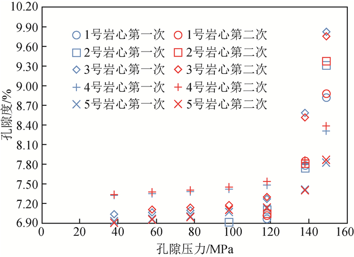 表2 地层压力条件孔隙度和覆压孔隙度测量结果对比Table 2 A comparison between porosity in situ and overburden pressure porosity |