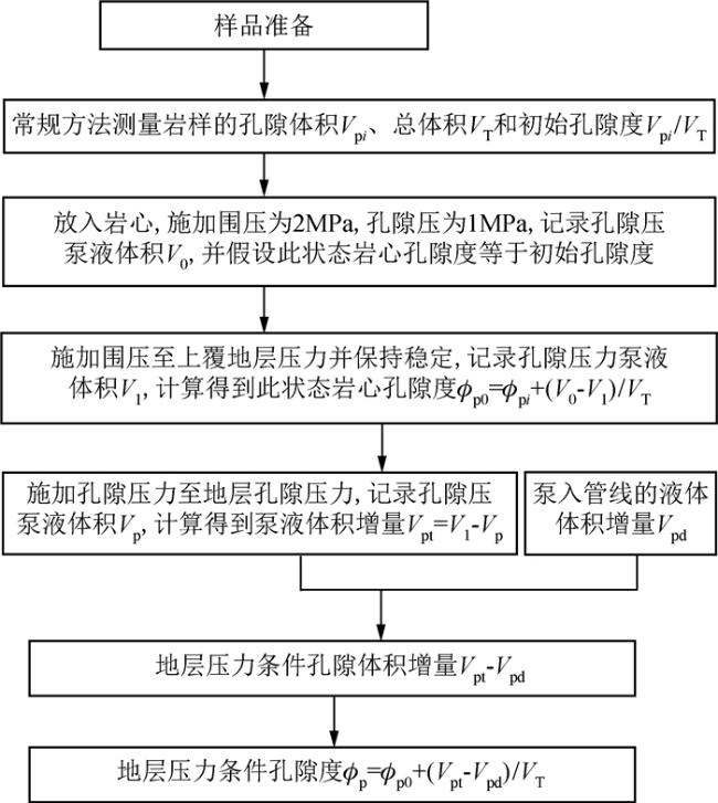 It is very important to measure the porosity in situ of overpressure deep reservoir for characterization and prediction. The normal method with back-pressure valve technology for exerting pore pressure and measurement of flow was not able to gain ideal porosity precision because of low control precision of pore pressure and low measurement precision of pore volume. A new measurement method for overpressure porosity was developed with the employment of double high precision constant pressure and speed pumps to exert pore pressure and measurement the increment of the pore volume. Firstly, the pore pressure was built by the double high precision constant pressure and speed pumps located both sides of rock sample. Secondly, an empirical relation between volume variation of dead volume and effective pressure was gotten through a set of calibration measurement with the employment of steel plug. Thirdly, the pore volume measured under the normal condition was adopt as basic pore volume. At last, the pore volume/porosity can be measured by the basic pore volume and the increment between the volume variation of bump and dead volume calculated through the empirical relation. The measurement results of 5 rock samples shows that the new method has good repeatability and matches the porosity measured under overburden pressure good.