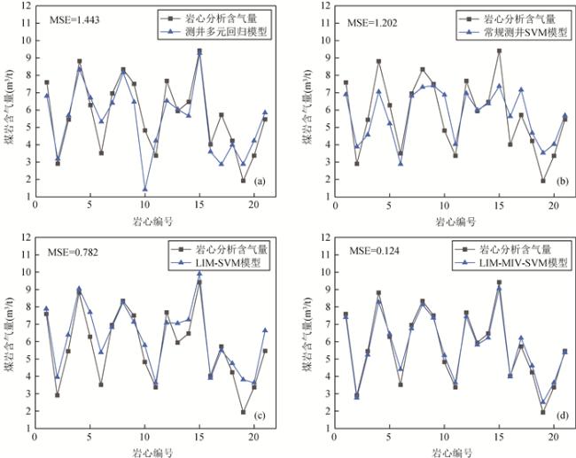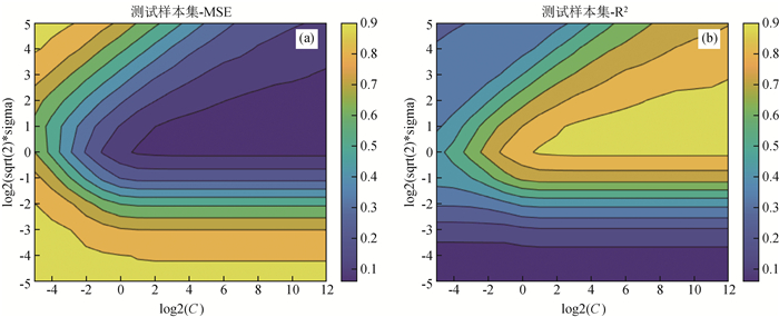 ) 参数组合,通过训练得到不同的回归模型和测试集均方误差,从这些组合中选择一个均方误差最小模型作为最终的SVM含气量回归模型,其中C的取值分别为(2-5, ,2-4,…,212),