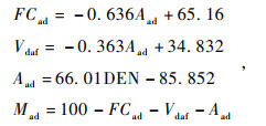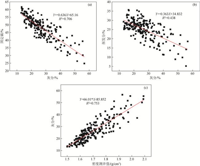 图4 煤岩不同工业组分相关性分析结果(a)灰分与固定碳质量含量相关关系;(b)灰分与挥发分质量含量相关关系;(c)灰分质量含量与密度测井值相关关系. Figure 4 The correlation analysis results of different coal industrial components (a) The correlation between ash content and fixed carbon content; (b) The correlation between volatile matter and ash content; (c) The correlation between ash content and density logging values. |