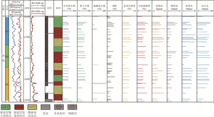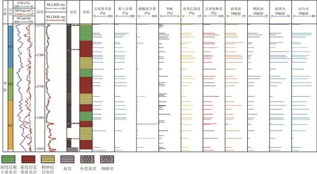 表1 长岭凹陷A井青一段页岩物性及含油性特征分布Table 1 Physical properties and oil bearing characteristics distribution of Qing1 Member shale in well A of Changling Sag |