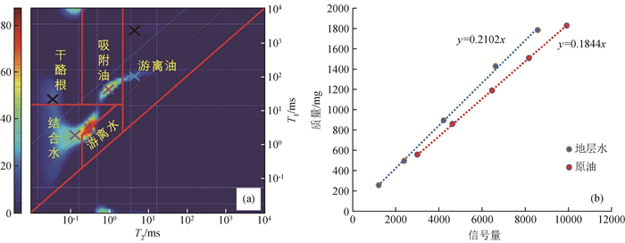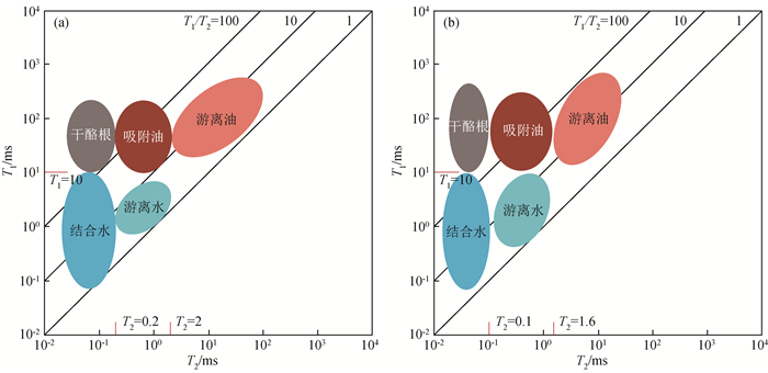 图3 松辽盆地长岭和古龙凹陷青一段页岩二维核磁共振流体识别图版对比(a)长岭凹陷青一段页岩储层二维核磁共振流体识别图版;(b)古龙凹陷青山口组页岩二维核磁共振流体识别图版(据白龙辉等,2021;石玉江等,2023修改). Fig 3 Comparisons of 2D-NMR fluid identification pattern of Qing1 Member shale in Changling and Gulong Sag of Songliao Basin (a)2D-NMR fluid identification pattern of Qing1 Member shale in Changling Sag; (b)2D-NMR fluid identification pattern of Qingshankou Formation shale in Gulong Sag(Modified by Bai et al., 2021; Shi et al., 2023). |