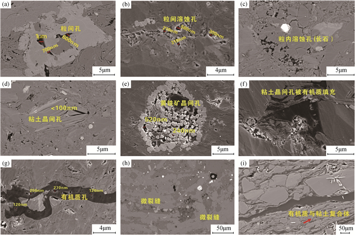 图5 长岭凹陷A井青一段页岩主要孔隙类型镜下特征(a)粒间孔,粉砂纹层页岩(深度:2369.96 m);(b)粒间溶蚀孔,粉砂纹层页岩(深度:2382.25 m);(c)粒内溶蚀孔,泥纹层长英质页岩(深度:2378.90 m);(d)黏土晶间孔,泥纹层长英质页岩(深度:2378.90 m);(e)黄铁矿晶间孔,泥纹层长英质页岩(深度:2382.25 m);(f)黏土晶间孔被有机质填充,泥纹层黏土质页岩(深度:2404.16 m);(g)有机质孔,粉砂纹层页岩(深度:2369.96 m);(h)微裂缝,含介壳粉砂纹层页岩(深度:2409.50 m);(i)有机质与黏土复合体,泥纹层黏土质页岩(深度:2404.16 m). Fig 5 Microscopic characteristics of main pore types of Qing1 Member shale in well A of Changling Sag (a)Intergranular pore, silty-laminated shales(depth: 2369.96 m); (b)Intergranular dissolution pore, silty-laminated shales(depth: 2382.25 m); (c)Intragranular dissolution pore, argillaceous-laminated felsic shales(depth: 2378.90 m); (d)Clay intercrystalline pore, argillaceous-laminated felsic shales(depth: 2378.90 m); (e)Pyrite intercrystalline pore, argillaceous-laminated felsic shales(depth: 2382.25 m); (f)Clay intergranular pores are filled with organic matter, argillaceous-laminated clay shales(depth: 2404.16 m); (g)Organic pore, silty-laminated shales(depth: 2369.96 m); (h)Microfracture, Silt-laminated shale with shell(depth: 2409.50 m); (i)Organic matter and clay complex, argillaceous-laminated clay shales(depth: 2404.16 m). |