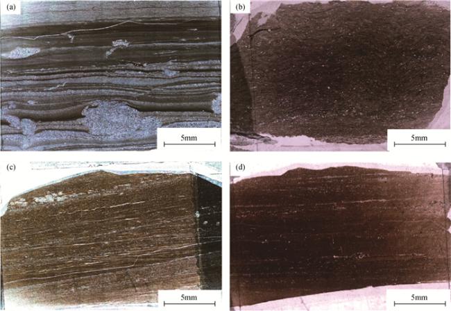 图4 长岭凹陷A井青一段页岩岩相薄片特征(a)粉砂纹层页岩(深度:2392.38 m);(b)介壳灰岩(深度:2370.18 m);(c)泥纹层长英质页岩(深度:2383.90 m);(d)泥纹层黏土质页岩(深度:2398.90 m). Fig 4 Thin section characteristics of lithofacies of Qing1 Member shale in well A of the Changling Sag (a)Silty-laminated shales(depth: 2392.38 m); (b)Shell limestone(depth: 2370.18 m); (c)Argillaceous-laminated felsic shales (depth: 2383.90 m); (d)Argillaceous-laminated clay shales(depth: 2398.90 m). |