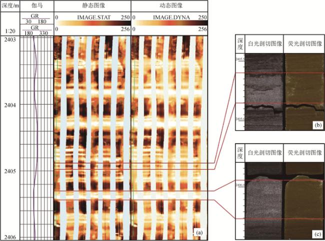 图6 长岭凹陷A井青一段页岩岩心深度归位(a)成像测井图(A井,2403.00~2406.00 m);(b,c)取心介壳灰岩岩心照片(A井,深度段分别为2405.52~2405.57 m、2405.99~2406.05 m). Figure 6 Shale core-depth homing process of Qing1 Member shale in well A of Changling Sag (a)Imaging logging(well A, 2403.00~2406.00 m); (b, c)Core photograph of shell limestone(well A, The depth segments are 2405.52~2405.57 m、2405.99~2406.05 m). |