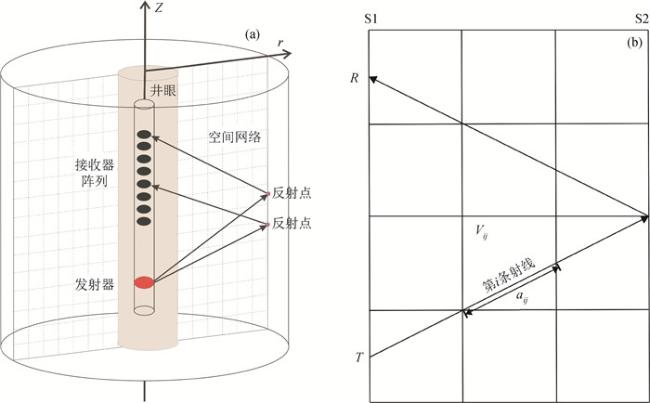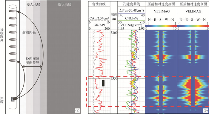 图1 基于滑行波首波到时的反演方法(钱玉萍等, 2018)(a)非均质地层中滑行波路径示意图;(b)该方法在实际资料中评价压裂效果的应用. Figure 1 The inversion with arrival time of slide waves (Qian et al., 2018) (a)Schematics of slide wave ray paths in a heterogeneous formation; (b)Application of the method in evaluating fracturing effect in actual data. |