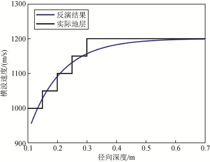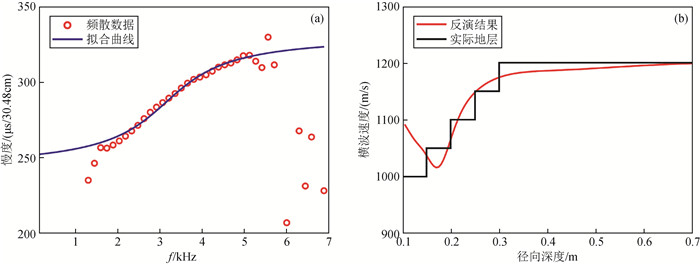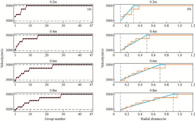 图4 不同层厚的非均质地层模型反演结果(Liu et al., 2021)(a)拾取的纵波速度序列;(b)纵波速度径向剖面. Fig 4 Inversion results of a heterogeneous formation model with different thickness of velocity variation region(Liu et al., 2021) (a)The sequence of extracted P-wave velocities; (b)Radial profiles of P-wave velocity. |
