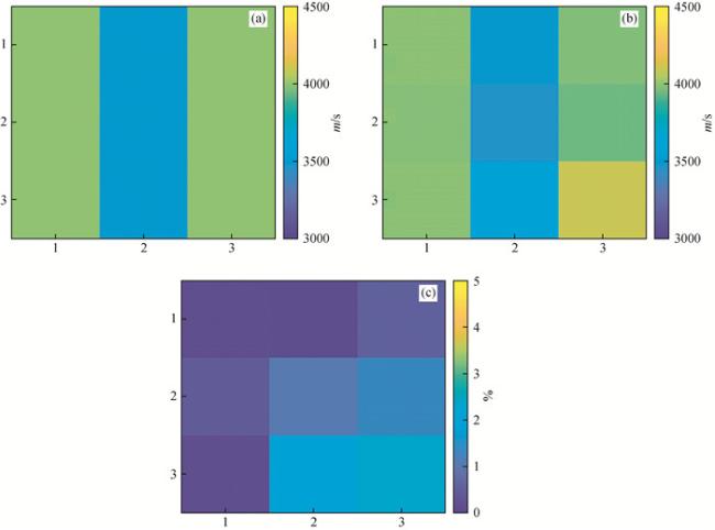 图3 基于反射波首波到时的概率加权ART反演方法(许令周和范宜仁,2011)(a)理论速度模型; (b)实际反演结果; (c)相对误差分析. Fig 3 Probability weighted ART inversion method with arrival time of reflection wave (Xu and Fan, 2011) (a)Theoretical velocity model; (b) Inversion results; (c) Relative error analysis. |
