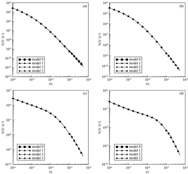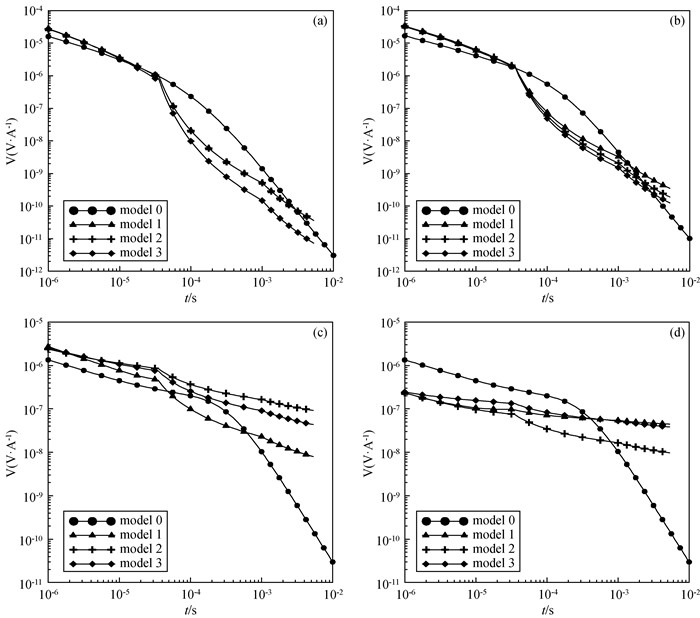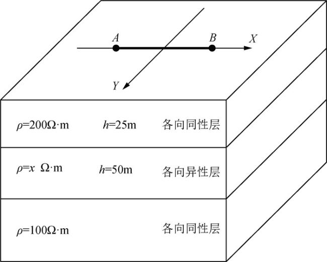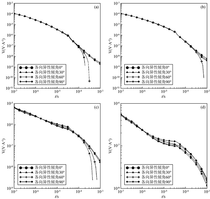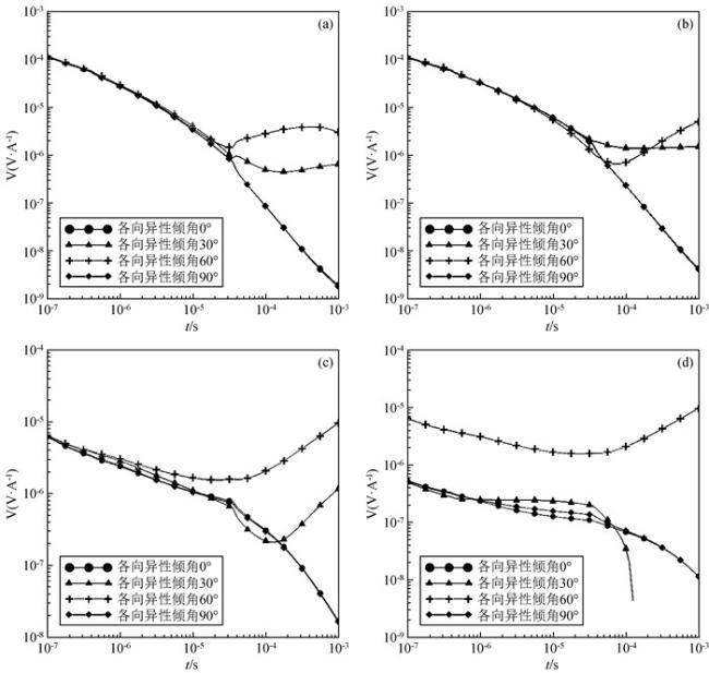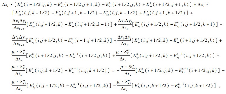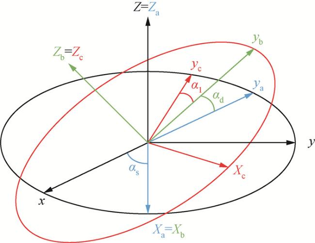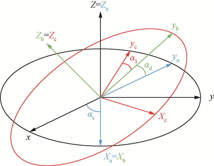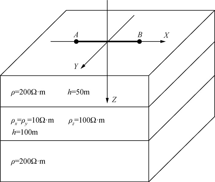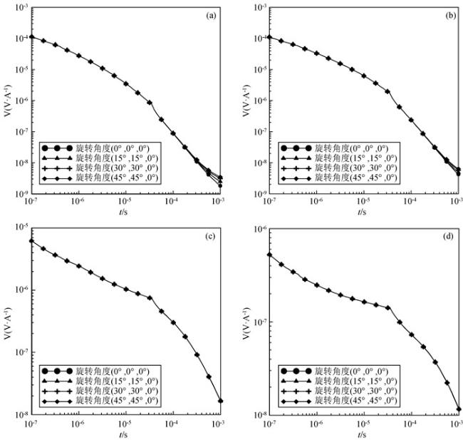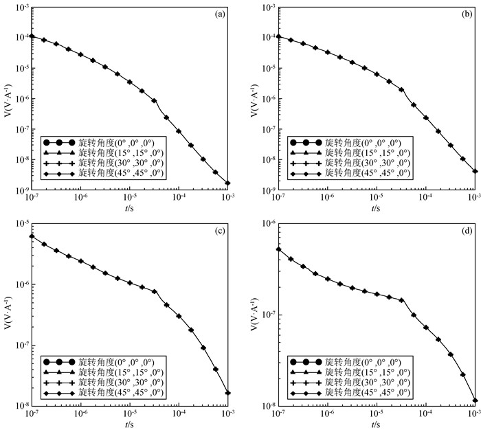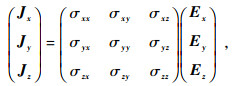 可以通过对主轴各向异性电导率张量做图 1所示的欧拉旋转得到.首先将原始坐标系绕z轴逆时针旋转角度αs得到一个新坐标系,然后将其绕新坐标系的x轴逆时针旋转角度αd得到中间坐标系,最后绕中间坐标系的z轴逆时针旋转角度αl得到最终坐标系.其中,αs、αd、al三个角度分别为各向异性走向角、各向异性倾角、各向异性偏角,每次旋转都可以得到对应角度的旋转矩阵,将旋转矩阵与主轴各向异性电导率张量相乘就可以得到