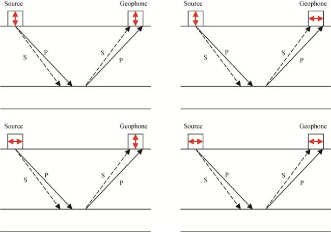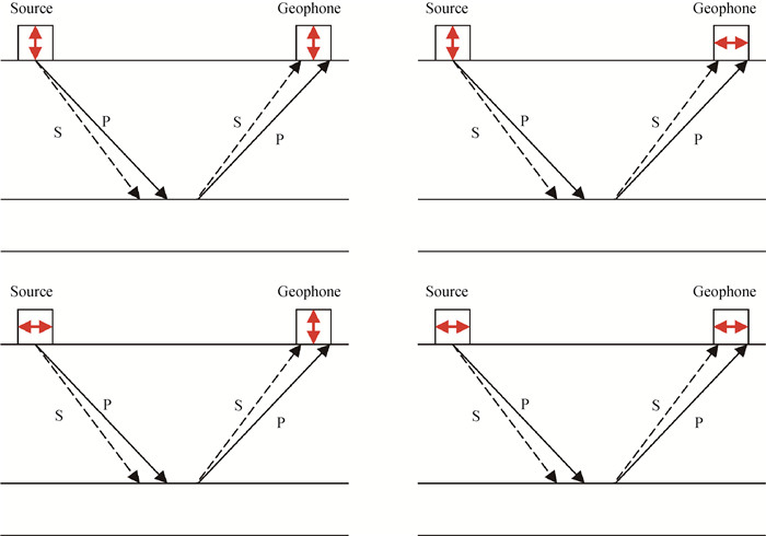 图1 多分量震源(箭头表示震源振动方向)和多分量检波器(箭头表示质点运动方向)物理实验示意图由垂直或水平力源运动产生的地震能量被垂直或水平方向的检波器分量记录.P波和S波均被无差别地产生和记录. Fig 1 Schematic diagram of a physics experiment involving a multicomponent source (arrows indicating source motion) and a multicomponent receiver (arrows indicating particle motion) is shown Seismic energy generated by either vertical or horizontal source motion is recorded by either vertically-or horizontally-oriented geophones. Both P and S waves are emitted and recorded indiscriminately. |