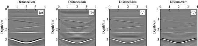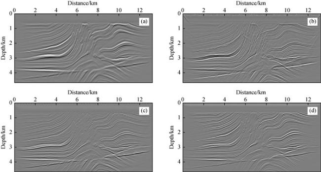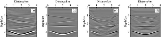 图4 偏移成像结果(仅在检波点进行波型分离)(a)x方向力源激发的P波成像;(b)z方向力源激发的P波成像;(c)x方向力源激发的S波成像;(d)z方向力源激发的S波成像. Fig 4 Migration results after mode decomposition on receiver-side only (a)P-wave image of data generated by directional force source acting in x direction; (b)P-wave image of data generated by directional force source acting in z direction; (c)S-wave image of data generated by directional force source acting in x direction; (d)S-wave image of data generated by directional force source acting in z direction, respectively. |