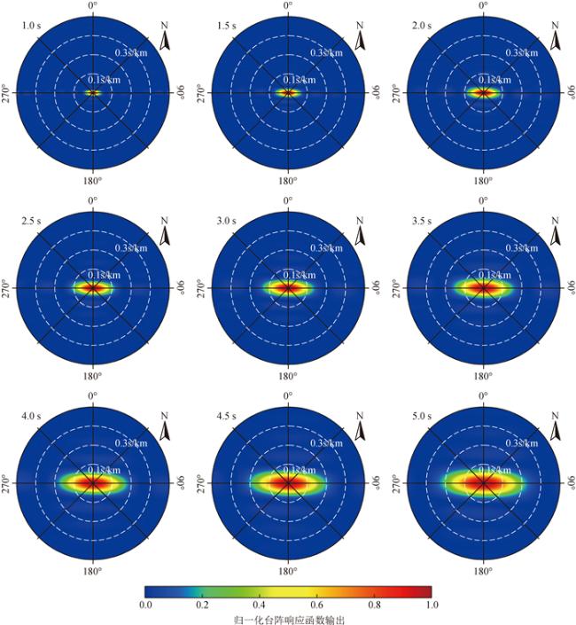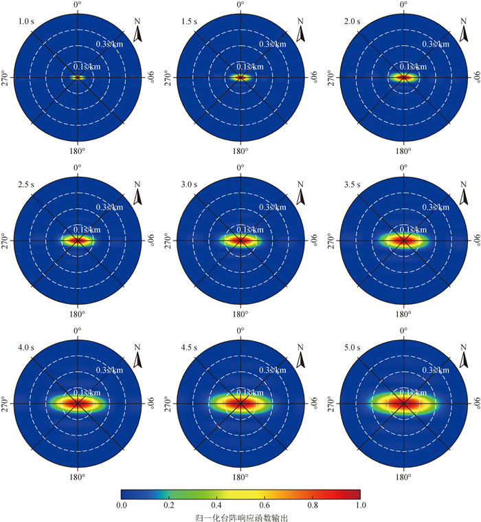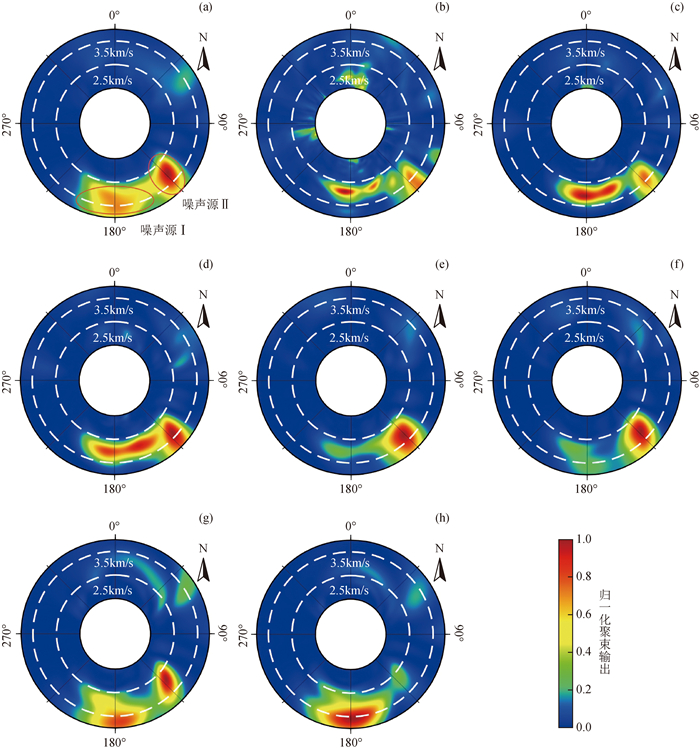 图4 不同频段的聚束输出结果不同子图为不同周期频段的聚束输出结果,依次为:(a)1.0~5.0 s;(b)1.0~2.0 s;(c)2.0~2.5 s;(d)2.5~3.0 s;(e)3.0~3.5 s;(f)3.5~4.0 s;(g)4.0~4.5 s;(h)4.5~5.0 s,白色虚线表示等速度线(单位为km/s),结果进行了归一化处理. Fig 4 Beamforming results at different periods and frequency bands The different subgraphs are the beamforming results of different frequency bands, which are: (a)1.0~5.0 s; (b)1.0~2.0 s; (c)2.0~2.5 s; (d)2.5~3.0 s; (e)3.0~3.5 s; (f)3.5~4.0 s; (g)4.0~4.5 s; (h)4.5~5.0 s. The white dashed line represents the constant velocity line (unit: km/s). The results in each subgraph are normalized by the maximum. |
