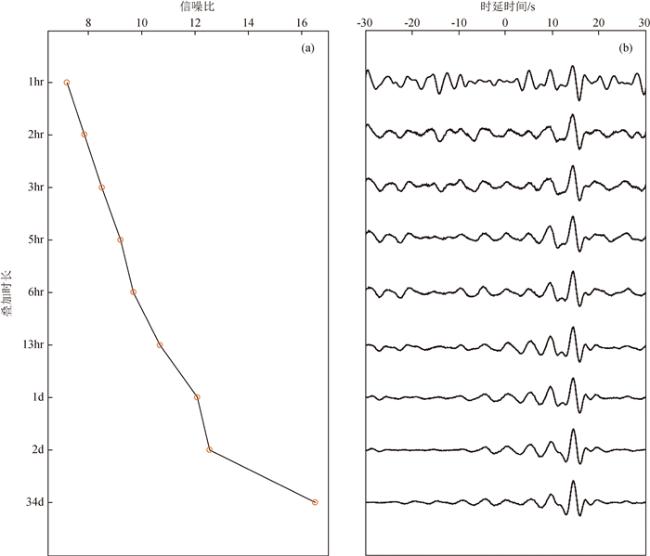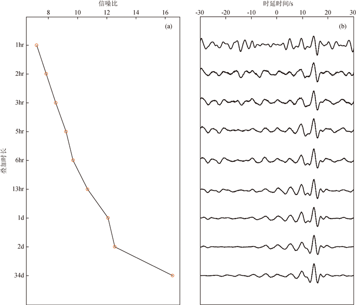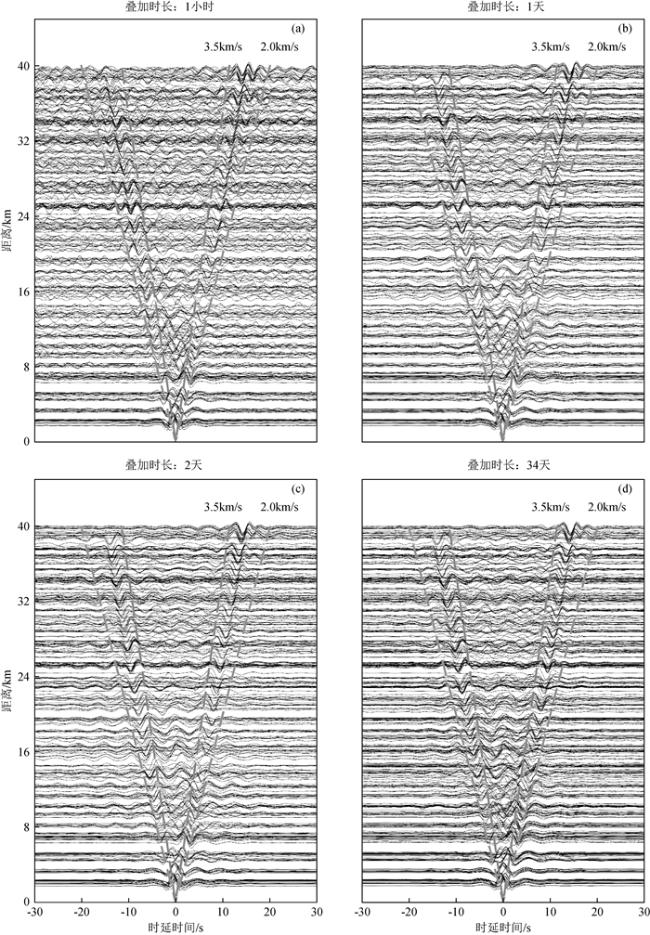 图6 部分台站对不同叠加时长的NCF相应子图的叠加时长依次为:(a)1 h;(b)1天;(c)2天;(d)34天. Fig 6 NCFs of different superposition time of some station pairs. The stacking time of the corresponding subgraphs is: (a)1 h; (b)1 day; (c)2 days; (d)34 days. |