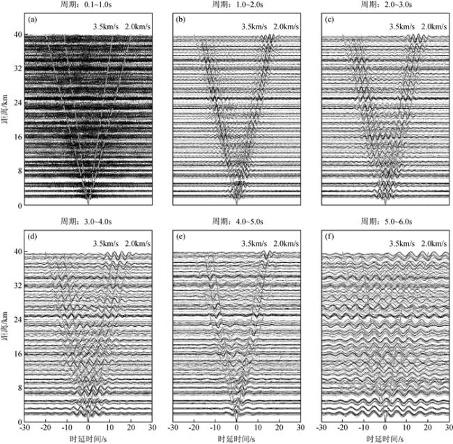 图2 部分台站对不同频段垂直分量的噪声互相关函数不同子图具有不同的滤波频段,依次为:(a)0.1~1.0 s;(b)1.0~2.0 s;(c)2.0~3.0 s;(d)3.0~4.0 s;(e)4.0~5.0 s;(f)5.0~6.0 s. 子图中的虚线表示标注的群速度的相应到时. Fig 2 NCFs of some station pairs at different period range Different subgraphs have different filtering frequency bands, which are: (a)0.1~1.0 s; (b)1.0~2.0 s; (c)2.0~3.0 s; (d)3.0~4.0 s; (e)4.0~5.0 s; (f)5.0~6.0 s. Dashed line in subgraphs denote the arrival time with the labeled group velocities. |