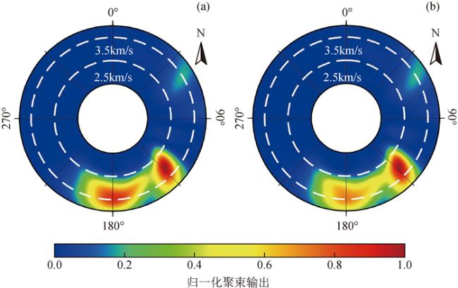 图5 基于不同时段的NCF计算得到的聚束输出(a)和(b)分别为基于1:00—5:00时段和10:00—14:00时段的NCF计算得到的聚束输出;子图中白色虚线表示等速度线(单位为km/s),结果进行了归一化处理. Fig 5 Beamforming results based on the NCFs at different time intervals (a) and (b) are the beamforming results calculated based on the NCF of 1:00—5:00 and 10:00—14:00, respectively. The white dashed line represents the constant velocity line (unit: km/s). The results in each subgraph are normalized by the maximum. |