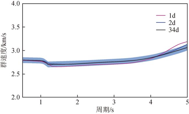 图8 基于某台站对不同叠加时长的噪声互相关函数测量得到的频散曲线以34天数据测量得到的频散曲线为参考,蓝色阴影区域表示与参考频散曲线相差2%以内的区域. Fig 8 The dispersion curve is measured based on the NCFs of different superposition time of a station pair Taking the dispersion curve measured by 34-day data as a reference, the blue shadow area represents the area within 2% difference from the reference dispersion curve. |
