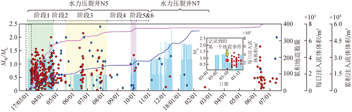 图6 中国长宁页岩气区块N5、N7井区地震活动和水力压裂操作的时间的关系(图改自Tan et al., 2020)插图显示了水压致裂(黑色虚线框)前10天记录到的地震.彩色矩形表示N5井水力压裂的不同阶段. Fig 6 Timing of the earthquakes and hydraulic fracturing stimulation at the studied well pads (modified from Tan et al., 2020) The inset shows the earthquakes recorded in the first 10 days of hydraulic fracturing (black dashed box). The colored rectangles denote the different phases of the fracturing process at the well pad N5. |