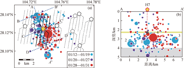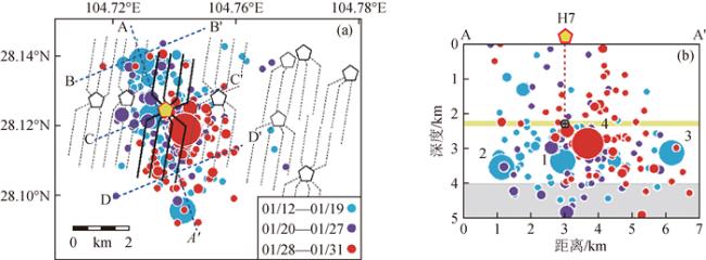图7 诱发地震活动典型空间分布图以四川盆地2017- 01 -12—19期间由水力压裂引起的H7井附近地区的地震活动分布特征为例(引自Meng et al., 2019). (a)水平方向的分布;(b)垂直方向的分布.其中不同颜色代表不同发震时间段,圆表示地震活动,其大小代表着震级的大小;橙色线代表水力压裂井深,灰色代表基底深度. Fig 7 Typical spatial distribution of induced seismicity The distribution characteristics of seismic activity in the vicinity of well H7 caused by hydraulic fracturing during 2017- 01 -12—19 in Sichuan Basin (modified from Meng et al., 2019). (a) Horizontal distribution; (b) Vertical distribution. Among them, different colors represent different seismic times, circles represent seismicity and are scaled on the basis of magnitude; The orange line represents the depth of the hydraulic fracturing well, and the gray line represents the crystalline basement rocks. |