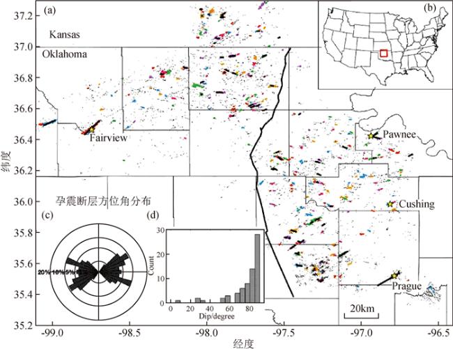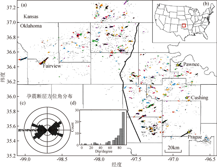 图8 基于俄克拉荷马州和堪萨斯州南部的诱发地震活动重定位结果刻画的断层分布(改自Qin et al., 2019)(a)地震丛以及所刻画断层分布.彩色代表有10个及以上地震事件的地震簇,黑色短线代表了30个及以上的事件刻画的断层.黄色五角星代表俄克拉荷马州4次M≥5地震的位置;(b)显示了研究区域的位置;(c)图(a)断层走向分布直方图;(d)图(a)断层倾角分布直方图. Fig 8 Mapped faults in Oklahoma and Southern Kansas based on the induced earthquake relocations (modified from Qin et al., 2019) (a)Earthquake clusters and mapped faults. colored dots represent the cluster with 10 and more events. the short black lines show the faults mapped from 30 and more events. Yellow stars show the location of four M≥5 earthquakes in Oklahoma; (b)The location of the study area; (c)Histogram of strike of faults in(a); (d)Histogram of dip of faults in(a). |