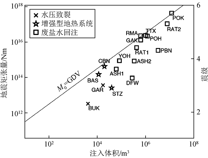 图9 最大震级(矩张量)与注入流体总量的关系估算(改自McGarr,2014)其中不同符号代表不同工业活动获得的数据. Fig 9 Estimation of the relationship between the maximum magnitude (moment tensor) and the total amount of injected fluid(modified from McGarr, 2014) The different symbols represent data obtained from different industrial activities. |