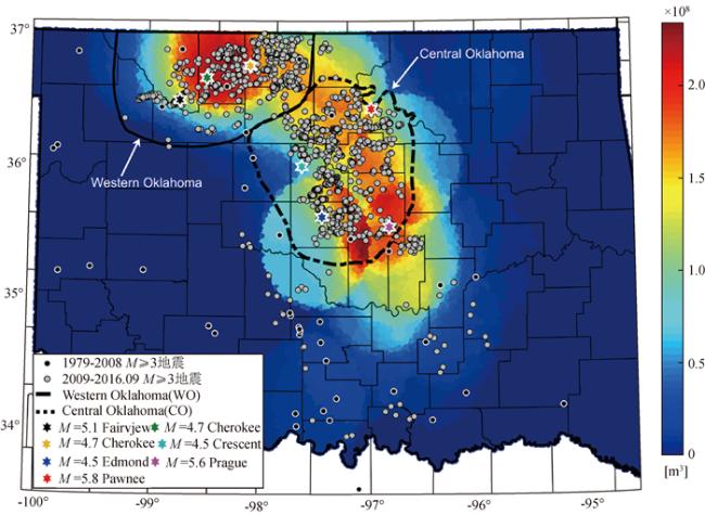 图2 美国Oklahoma州地区废水回注与地震活动分布(改自Langenbruch and Zoback., 2016; 张捷等,2021)背景颜色显示了俄克拉荷马州不同地区2009年至2015年12月期间注入废水累积体积(m3).黑色圆圈代表(1979—2008年的地震活动,灰色圆圈代表2009—2016- 09地震活动.彩色五角星代表几次M≥4.5地震活动. Fig 2 Waste saltwater disposal and earthquakes in Oklahoma (modified from Langenbruch and Zoback, 2016; Zhang et al., 2021) The background color shows the cumulative volume (m3) of saltwater injected into the Arbuckle formation between 2009 and December 2015 in different areas of Oklahoma. Black circles are earthquakes from 1979—2008, Gray circles are earthquakes from 2009—2016.09. Colored stars show the locations of M≥4.5 earthquakes. |