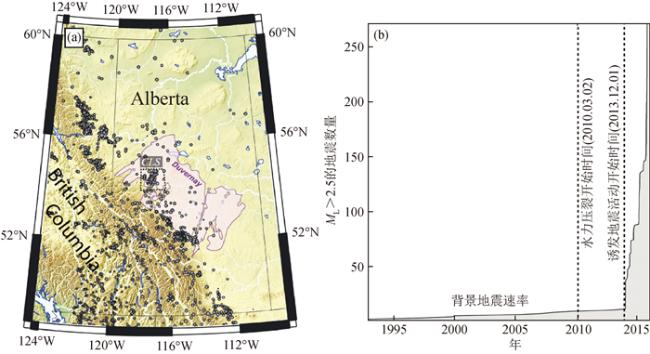 图3 加拿大Duvernay Play地区地震活动的空间和时间分布(改自Schultz et al., 2017;张捷等,2021)(a)浅紫色区域为Duvernay Play区域,灰色圆圈代表地震活动,CLS虚线框为the Crooked Lake序列; Fig 3 Spatial and temporal distribution of seismic activity in Duvernay Play, Canada (modified from Schultz et al., 2017; Zhang et al., 2021) (a) Purple area shows the Duvernay Formation, the gray circles show the seismicity, CLS dashed lines show the the Crooked Lake Sequences; |