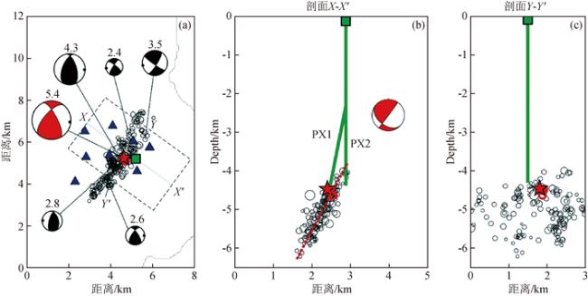 图4 诱发地震活动典型空间分布图(修改自Kim et al., 2018)(a)Pohang序列主震(红色五角星)、前震(红色圆),震后3 h的余震(黑色空心圆)分布.绿色正方形为水力压裂操作井台.蓝色三角形为地震台.红色海滩球代表了主震的震源机制.黑色海滩球表示代表性余震的震源机制解; Fig 4 Typical spatial distribution of induced seismicity (modified from Kim et al., 2018) (a)Epicenters of foreshocks (red circles), mainshock (red star), and aftershocks (black open circles) recorded in the first 3 hours after the mainshock. The location of the Pochang EGS is indicated by a green square. Blue triangles represent the seismic stations. The red beach ball represents the source mechanism of the mainshock. Black beach balls show the focal mechanism solutions of the aftershocks; |