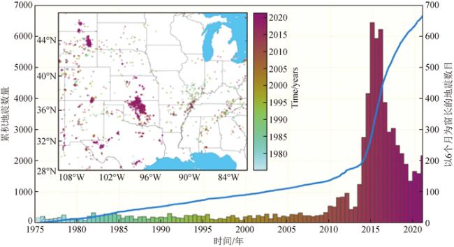 图5 1975年至2020年美国中大陆3级以上地震次数的演变数据来自USGS的ANSS目录(2017).统计数据显示,由于向美国俄克拉荷马州的Arbuckle地层注入大量废水,地震次数急剧增加.这个数字是Rubinstein和Mahani(2015)和Ellsworth(2013)的更新版本.图改自 https://eos.org/editors-vox/understanding-and-anticipating-induced-seismicity. Fig 5 Evolution of the number of earthquakes of a magnitude greater than 3 between 1975 and 2020 in mid-continental USA The data comes from the ANSS catalogue of USGS (2017). The statistics show the dramatic increase of the number of earthquakes attributed to the injection of significant amounts of wastewater into the Arbuckle formation in Oklahoma, USA. This figure is an update of versions by Rubinstein and Mahani (2015) and Ellsworth (2013)(modified from https://eos.org/editors-vox/understanding-and-anticipating-induced-seismicity). |