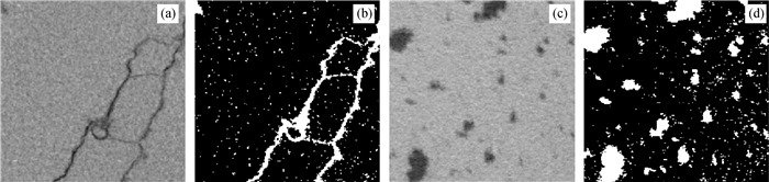 图1 岩心CT扫描图像的二值化处理(a)孔洞-裂缝型岩样CT扫描图像;(b)孔洞-裂缝型岩样CT扫描图像对应二值化图像; Fig 1 Binary processing of CT scan images of rock cores (a) CT scan images of pore-crack type rock samples; (b) CT scan images of pore-crack type rock samples correspond to binary images; |