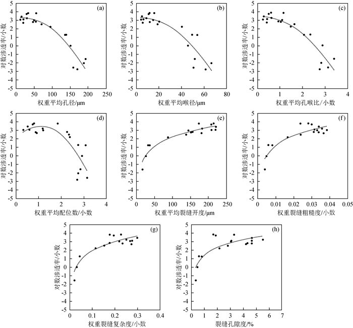 表3 权重孔隙结构参数与对数渗透率相关系数表Table 3 Table of correlation coefficients between weighted pore structure parameters and logarithmic permeability |