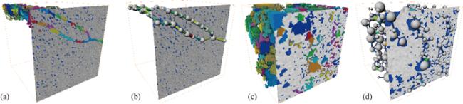 图2 基于数字岩心提取的孔隙空间模型(a)孔洞-裂缝型岩样提取得到的连通孔隙空间;(b)孔洞-裂缝型岩样连通孔隙空间孔喉球棍模型;(c)孔洞型岩样提取得到的连通孔隙空间;(d)孔洞型岩样连通孔隙空间孔喉球棍模型. Fig 2 Pore space models based on digital core extraction (a) The connected pore space obtained from the extraction of pore-crack type rock samples; (b) Pore-crack type rock sample connected pore space pore throat ball stick model; (c) The connected pore space obtained from the extraction of porous type rock samples; (d) Porous type rock sample connected pore space pore throat ball stick model. |