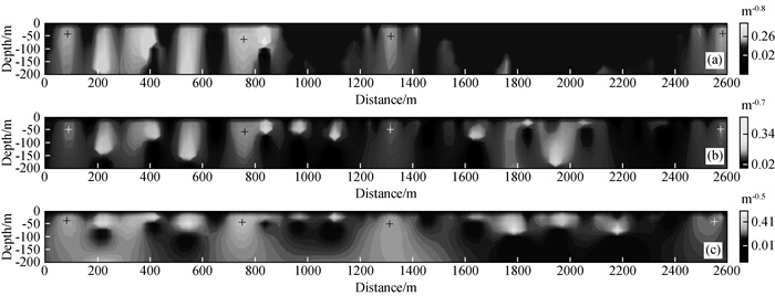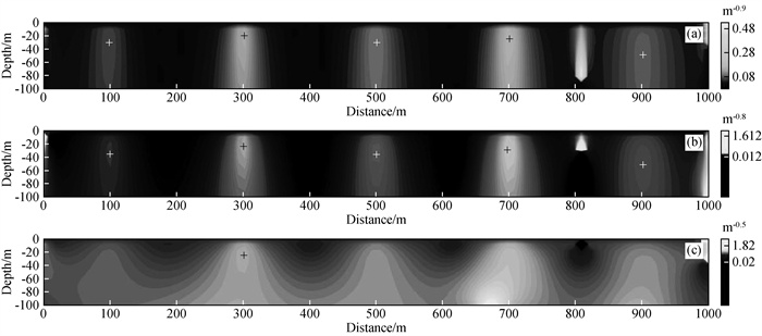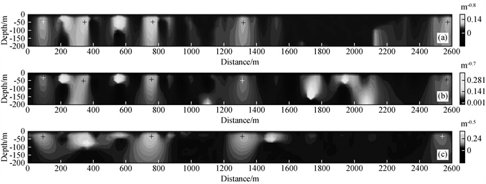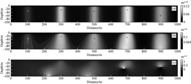 图12 AA′剖面不同β的2阶局部波数DEXP成像结果(a)β=0.2;(b)β=0.3;(c)β=0.5. Fig 12 The second-order DEXP image with different β applied to the magnetic anomaly of the profile AA′ (a)β=0.2;(b)β=0.3;(c)β=0.5. |